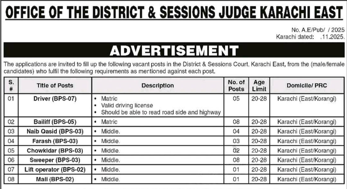 CAREER OPPORTUNITIES District & Sessions Court Karachi East Jobs 2025 Apply Now The Office of the District and Sessions Judge, Karachi East, has announced a recruitment drive for multiple vacant posts, inviting applications from eligible male and female candidates holding a Domicile/PRC of Karachi (East/Korangi). The vacancies cover various Class III and Class IV posts, and candidates… Read More »