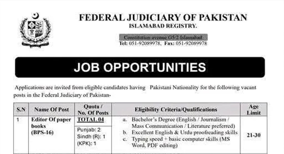 CAREER OPPORTUNITIES Federal Judiciary of Pakistan New Jobs 2025 VACANT POSITIONS The Federal Judiciary of Pakistan, operating from its Islamabad Registry, is inviting applications from eligible candidates with Pakistani Nationality to fill various vacant posts. The recruitment drive covers positions from BPS-02 to BPS-16, with a focus on administrative, clerical, and support staff. IMPORTANT INSTRUCTIONS &… Read More »