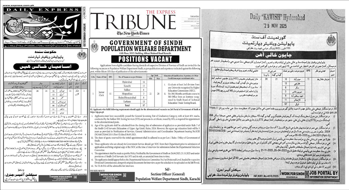 CAREER OPPORTUNITIES Population Welfare Department Sindh Jobs 2025 The Government of Sindh, Population Welfare Department, is inviting applications from eligible candidates with a domicile of Sindh to fill a total of 57 vacant posts of Junior Clerk (BPS-11). The positions are open across six major regions, and candidates must meet the specified educational, IT proficiency, and testing requirements. VACANT POSITIONS… Read More »