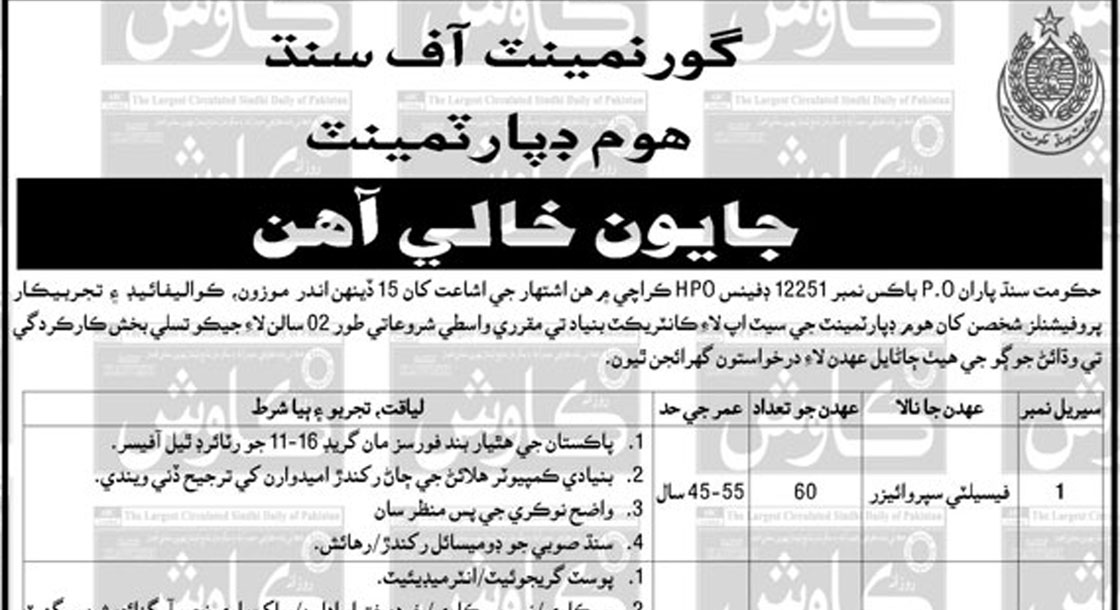 CAREER OPPORTUNITIES Home Department Sindh Jobs 2026 January Advertisement We hope you achieve your goals and land a well-paying job. We over at https://idealjobs.pk are working hard towards your better future, and we hope you will always support our platform. VACANT POSITIONS IMPORTANT INSTRUCTIONS & HOW TO APPLY