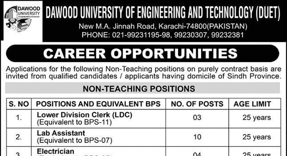 CAREER OPPORTUNITIES The Dawood University of Engineering and Technology New Jobs 2026 We hope you achieve your goals and land a well-paying job. We over at https://idealjobs.pk are working hard towards your better future, and we hope you will always support our platform. VACANT POSITIONS IMPORTANT INSTRUCTIONS & HOW TO APPLY