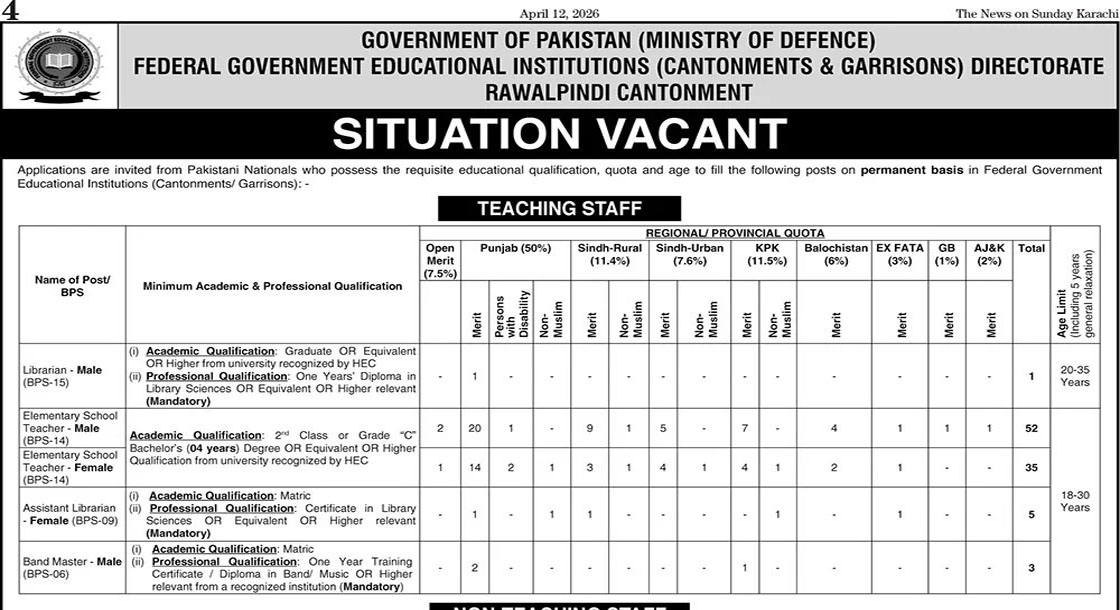 CAREER OPPORTUNITIES Federal Government Educational Institutions FGEI Jobs 2026 FGEI Jobs 2026 provides a complete guide to the massive recruitment drive announced by the Federal Government Educational Institutions (Cantonments & Garrisons) Directorate under the Ministry of Defence. It is optimized for Google Discover and SEO for job seekers across Pakistan. VACANT POSITIONS IMPORTANT INSTRUCTIONS & HOW TO APPLY