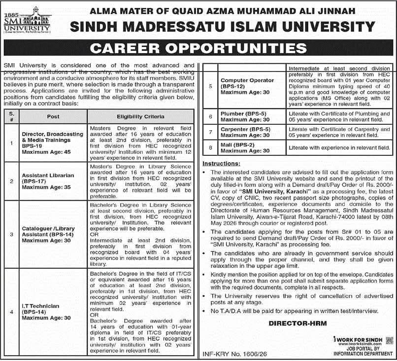 𝐒𝐢𝐧𝐝𝐡 𝐌𝐚𝐝𝐫𝐞𝐬𝐬𝐚𝐭𝐮𝐥 𝐈𝐬𝐥𝐚𝐦 𝐔𝐧𝐢𝐯𝐞𝐫𝐬𝐢𝐭𝐲 𝐊𝐚𝐫𝐚𝐜𝐡𝐢 𝐉𝐨𝐛𝐬 𝟐𝟎𝟐𝟔 𝐀𝐩𝐫𝐢𝐥 / 𝐌𝐚𝐲 𝐀𝐩𝐩𝐥𝐲 𝐎𝐧𝐥𝐢𝐧𝐞 𝐈𝐓 𝐓𝐞𝐜𝐡𝐧𝐢𝐜𝐢𝐚𝐧, 𝐂𝐨𝐦𝐩𝐮𝐭𝐞𝐫 𝐎𝐩𝐞𝐫𝐚𝐭𝐨𝐫 & 𝐎𝐭𝐡𝐞𝐫𝐬 𝐋𝐚𝐭𝐞𝐬𝐭