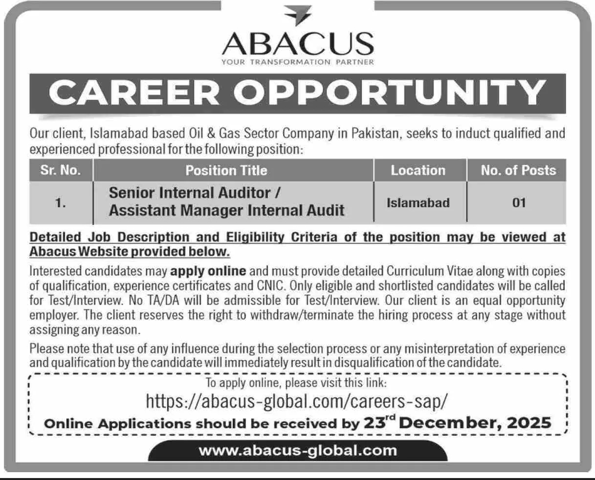 Abacus (Your Transformation Partner) is recruiting a qualified and experienced professional for its client, a prominent Islamabad-based Oil & Gas Sector Company in Pakistan. This search is for a specialist in internal auditing to fill a single, key position.