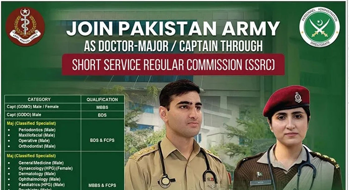 CAREER OPPORTUNITIES Join Pakistan Army as Doctor 2026 As Captain & Major Jobs Through SSRC The Pakistan Army has officially announced Join Pakistan Army as Doctor 2026 through Short Service Regular Commission (SSRC). This golden opportunity is open for MBBS, BDS, and FCPS qualified doctors to join as Captain and Major in the Army Medical Corps (AMC). Male and Female doctors from across Pakistan are… Read More »