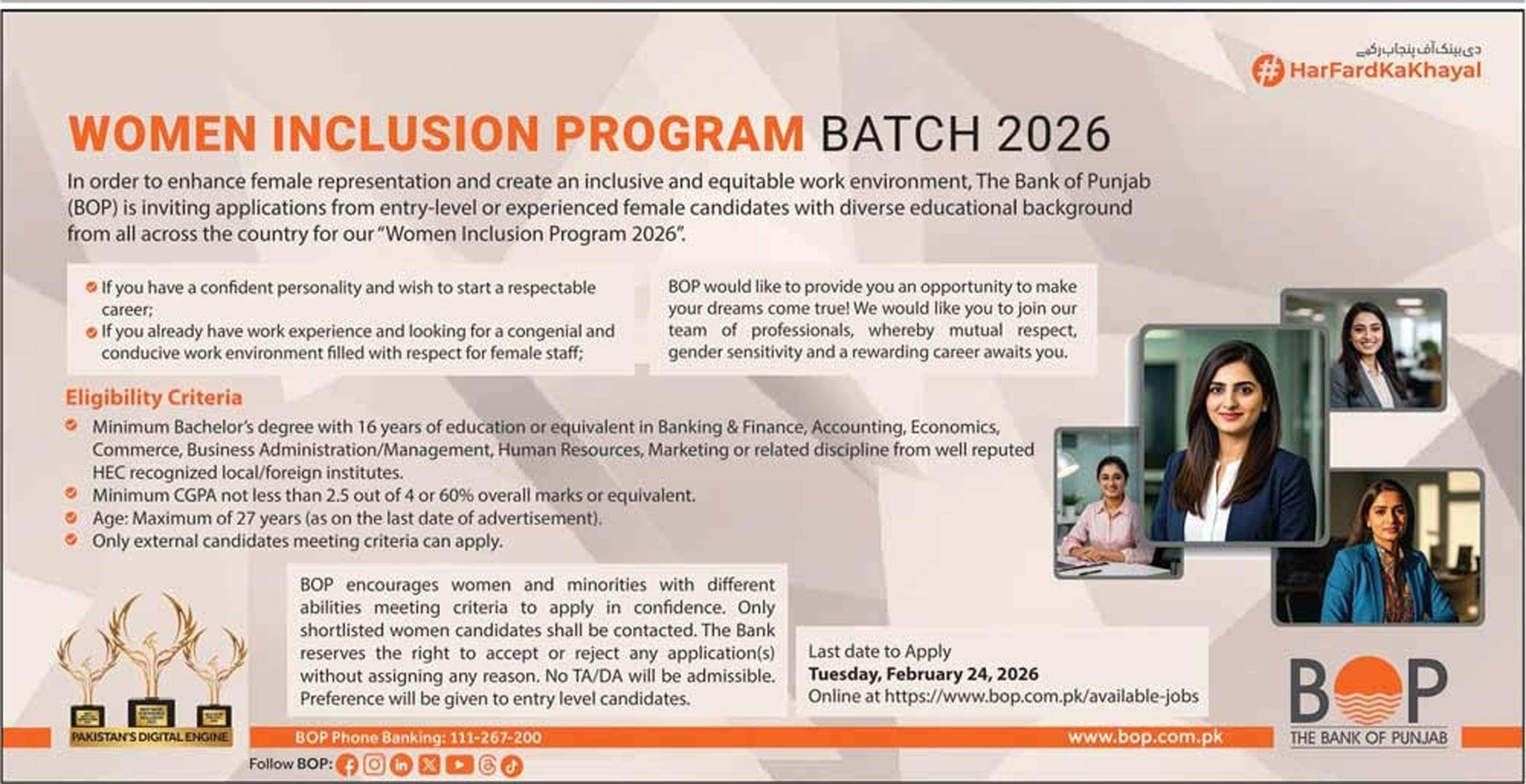 BOP Women Inclusion Program Batch 2026 This comprehensive guide provides everything you need to know about the BOP Women Inclusion Program Batch 2026. If you are a female graduate or an experienced professional in Pakistan looking to build a career in a respectful and inclusive environment, this is your ultimate roadmap to joining one of the country’s most prestigious financial institutions.