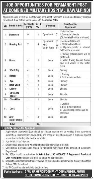Combined Military Hospital (CMH) Rawalpindi has announced multiple permanent job opportunities for eligible Pakistani citizens. This new recruitment drive offers positions ranging from technical and skilled roles to basic support staff. Interested candidates can apply for various posts according to their qualifications, experience, and domicile criteria.