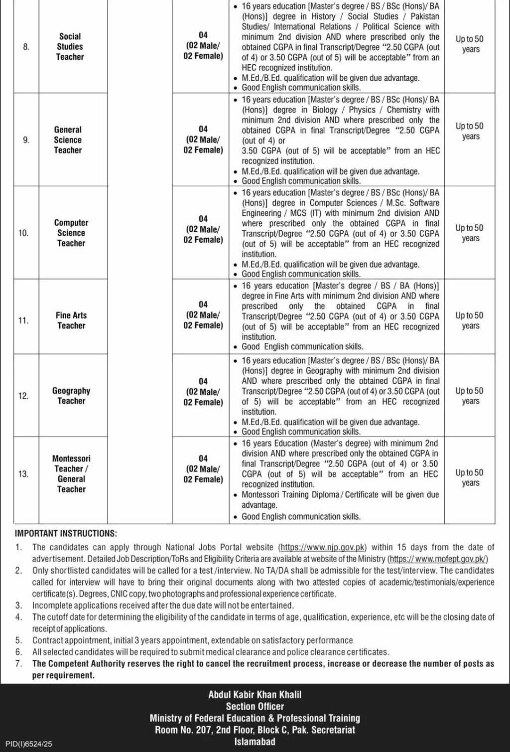 - Applicants must possess 16 years of education (Master’s Degree / BS / BSc Hons / BA Hons) in the relevant subject from an HEC-recognized institution.