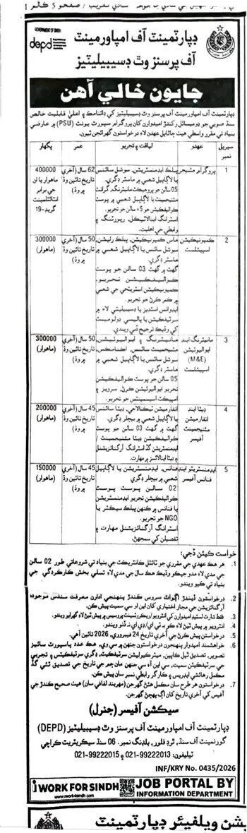 • Submit Application: Applications should be sent in a sealed envelope clearly mentioning the post name to the Section Officer (General), DEPD Sindh.