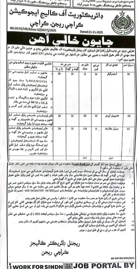 The Directorate of College Education, Karachi Region, Government of Sindh, has announced a significant recruitment drive for various non-teaching and administrative positions. Applications are invited from eligible male and female candidates holding a domicile of the Karachi Region. A total of 207 vacant posts are open, requiring submission within fifteen (15) days of the advertisement’s publication.