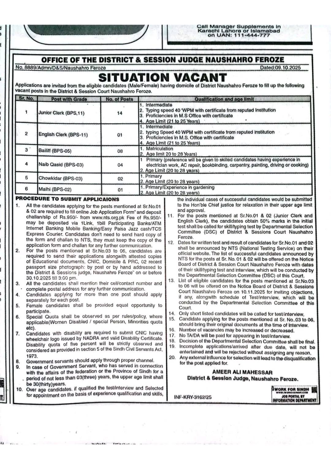 - Application Deadline for S. No. 3-6: For the posts of Bailiff, Naib Qasid, Chowkidar, and Mali, applications must be sent directly via registered post to the District & Sessions Judge, Naushahro Feroze, along with attested copies of educational documents, CNIC, Domicile, PRC, and two recent passport-sized photographs. The deadline for these posts is 30-10-2025 at 03:00 PM.
