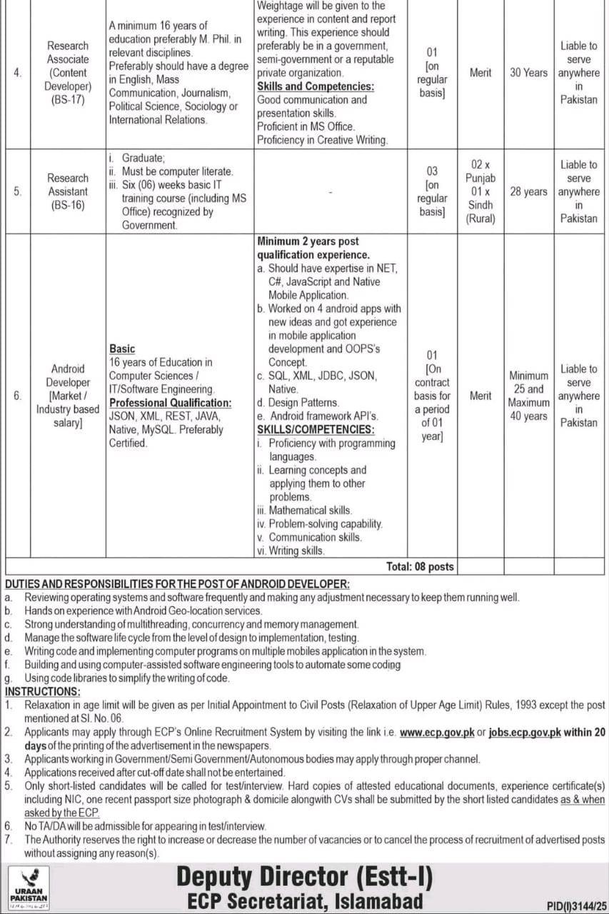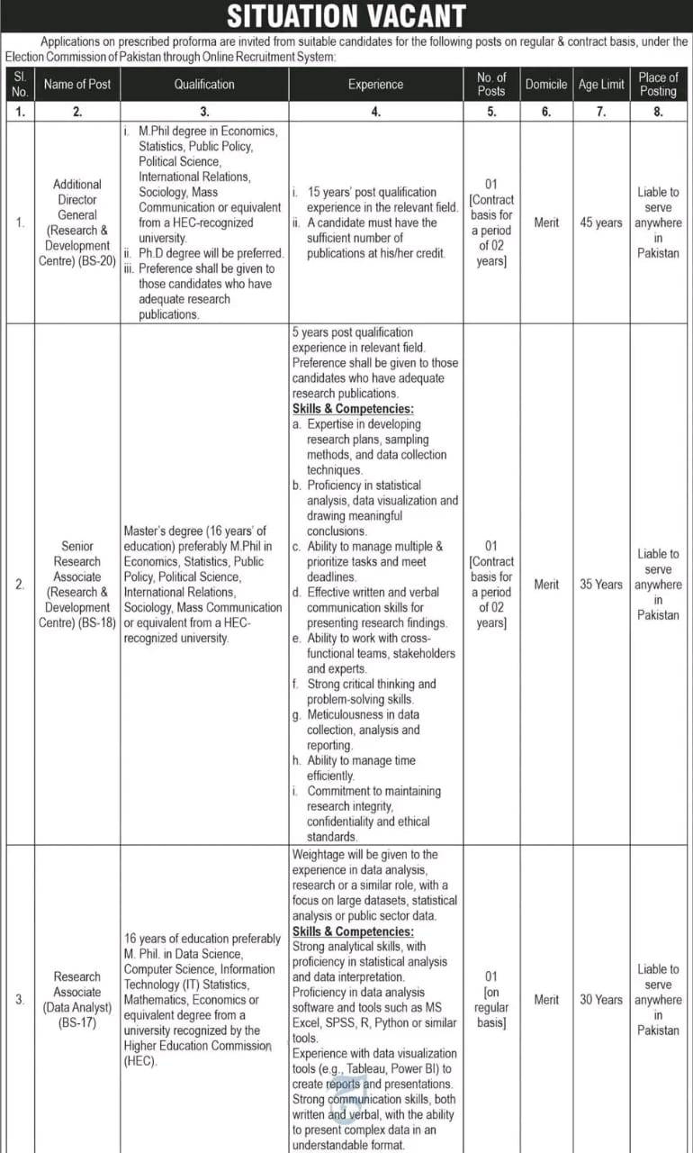 This is a significant opportunity for experienced researchers, data analysts, content developers, and IT professionals to join a key constitutional body of Pakistan. The application process is managed through the ECP’s Online Recruitment System, and the deadline is within 20 days of the date of the advertisement’s publication.