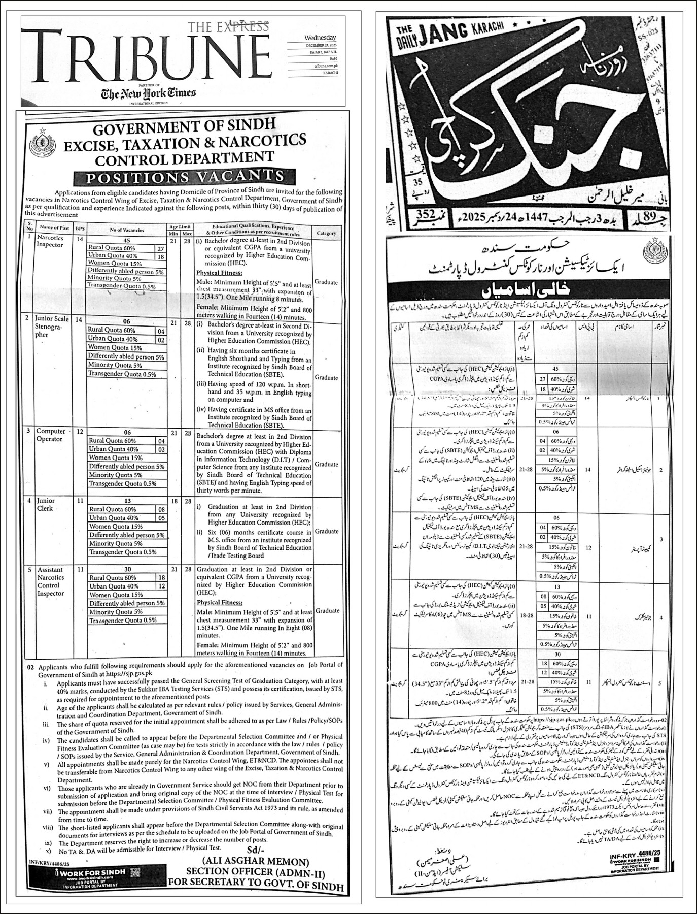 Excise Taxation & Narcotics Control Department Sindh Jobs 2026 Sindh Job Portal