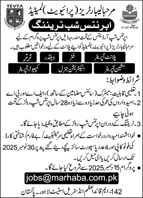 Marhaba Laboratories Pvt Ltd Lahore Apprenticeship Training 2025