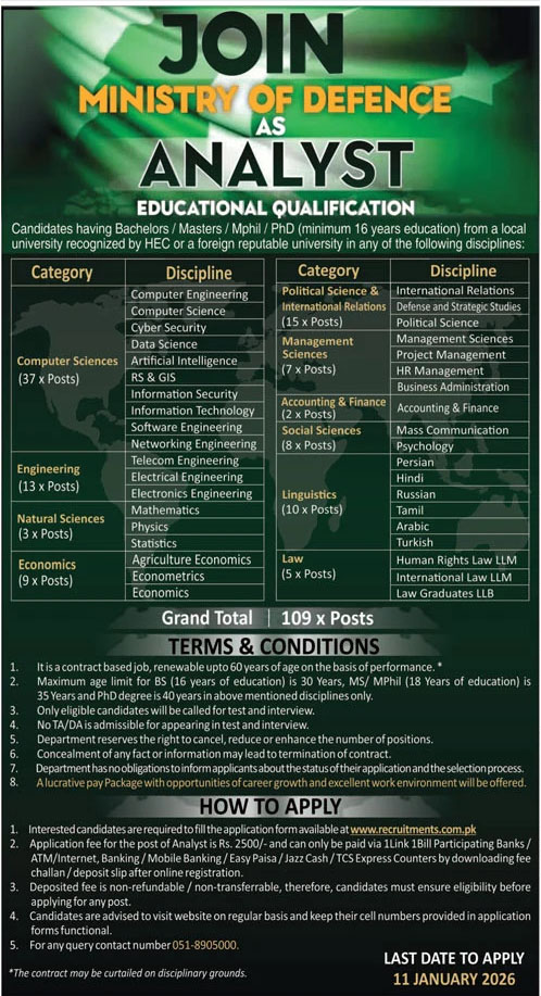 The Ministry of Defence (MOD), Government of Pakistan, has officially announced Analyst Jobs 2026, offering a prestigious opportunity for highly educated individuals to serve the country in a strategic and professional role. According to the latest advertisement, 109 Analyst positions are available across multiple academic disciplines, including Computer Sciences, Engineering, Social Sciences, Economics, Law, Linguistics, and Management Sciences.