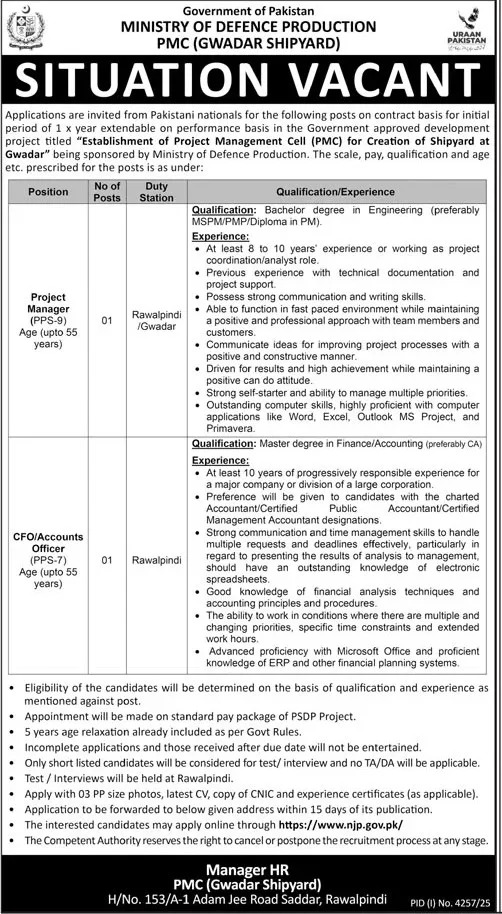 The Ministry of Defence Production Jobs 2025 have been officially announced for the Project Management Cell (PMC) Gwadar Shipyard, inviting applications from highly qualified and experienced Pakistani nationals. These positions are offered on a contract basis for 1 year, extendable depending on satisfactory performance and project requirements.