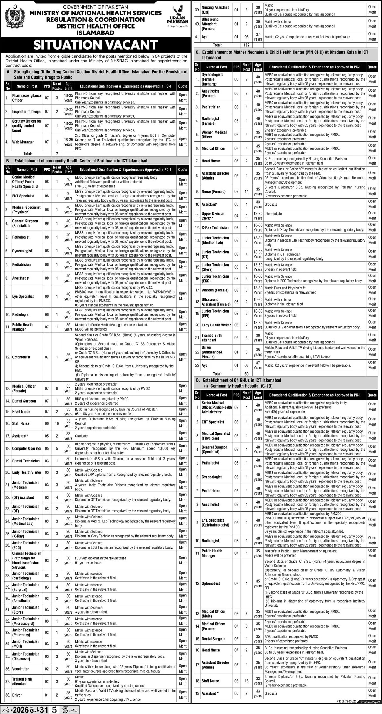 The District Health Office, Islamabad, has officially announced over 200 job vacancies for multiple high-impact health projects across the Islamabad Capital Territory (ICT). These positions are being offered on a contract basis under various Project Pay Scales (PPS), aiming to strengthen the drug control section, community health centers, and BHUs.