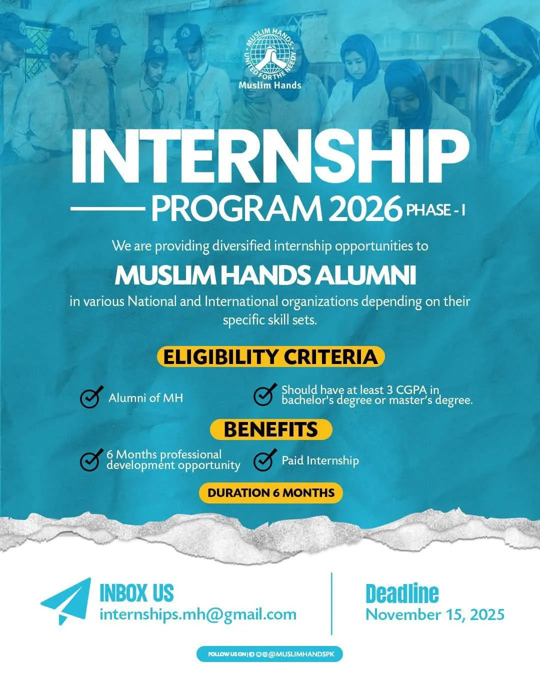 Muslim Hands has officially announced the launch of its “Internship Program 2026 – Phase I,” offering diversified internship opportunities exclusively for its alumni. The program is designed to place talented alumni in various national and international organizations based on their specific skill sets. This is a premier opportunity for former students and beneficiaries of Muslim Hands’ educational or developmental programs to gain valuable professional experience and kickstart their careers. The program offers a structured, six-month paid internship, providing a perfect blend of professional development and practical exposure. The deadline for applications is November 15, 2025.