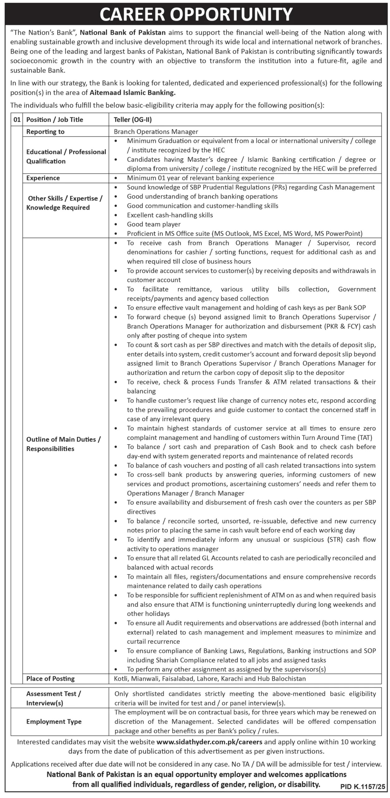 National Bank of Pakistan NBP Karachi Teller Jobs 2025 NBP, being one of the largest financial institutions in Pakistan, plays a pivotal role in promoting financial inclusion, sustainable growth, and national economic stability. This article provides complete details about the NBP Teller (OG-II) Jobs 2025, including eligibility criteria, skills requirements, job responsibilities, and the online application procedure.