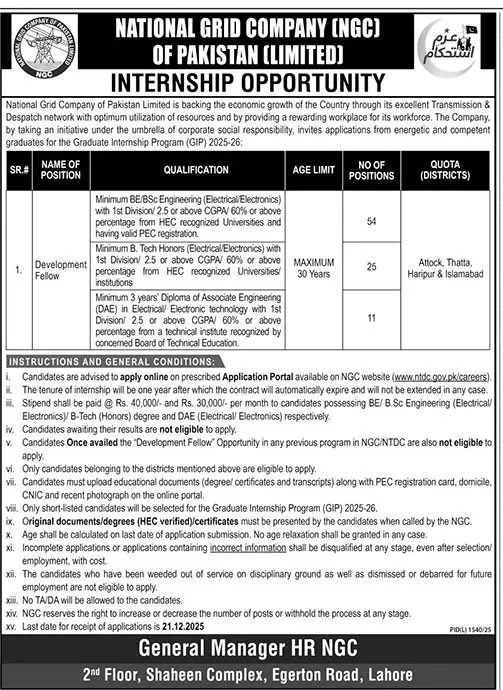 The National Grid Company (NGC) of Pakistan (Limited) has announced the Graduate Internship Program (GIP) 2025–26, offering excellent opportunities for fresh engineering and technical graduates. This initiative aims to empower young graduates through hands-on training in Pakistan’s vital transmission and dispatch network.