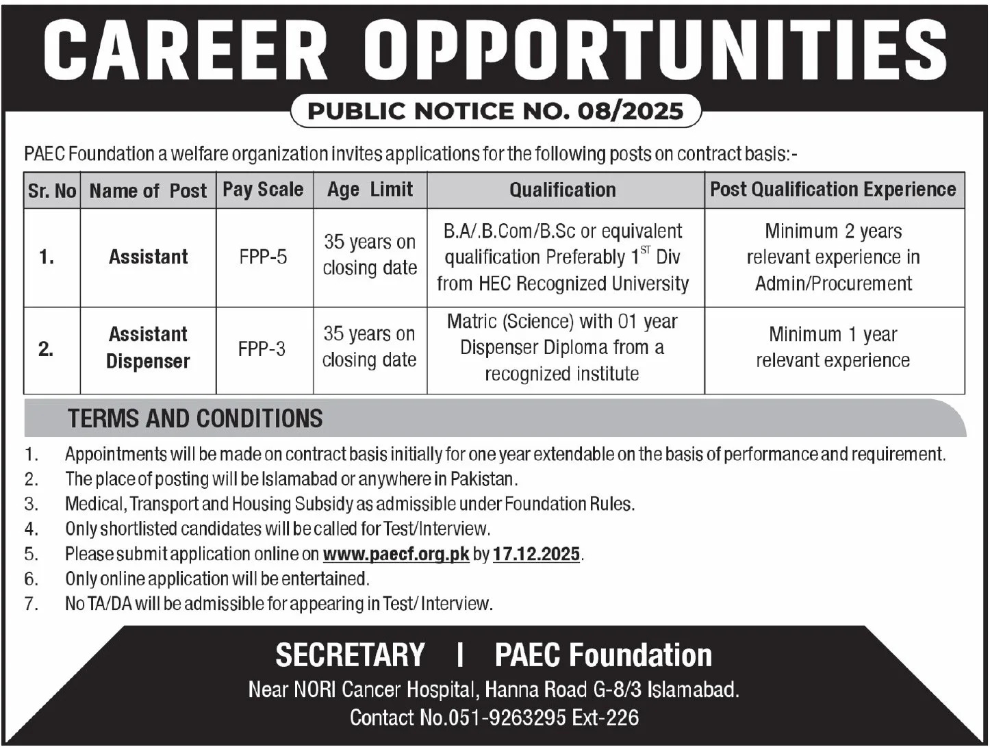 The PAEC Foundation has announced new PAEC Foundation Jobs 2025 under Public Notice No. 08/2025. These vacancies are offered on a contract basis and are open to qualified Pakistani candidates. The recruitment will be made strictly on merit, and applications must be submitted online through the official website www.paecf.org.pk before the closing date.