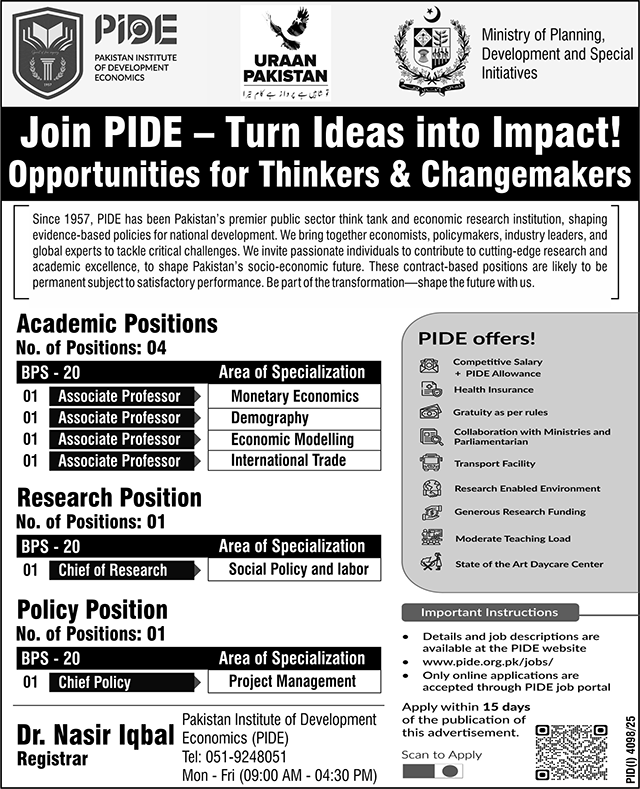 The Pakistan Institute of Development Economics (PIDE) has announced new job openings for 2025, inviting talented, visionary, and research-driven professionals to join Pakistan’s premier public-sector think tank. With a rich legacy dating back to 1957, PIDE stands at the forefront of economic research, policy design, public sector reforms, and academic excellence.