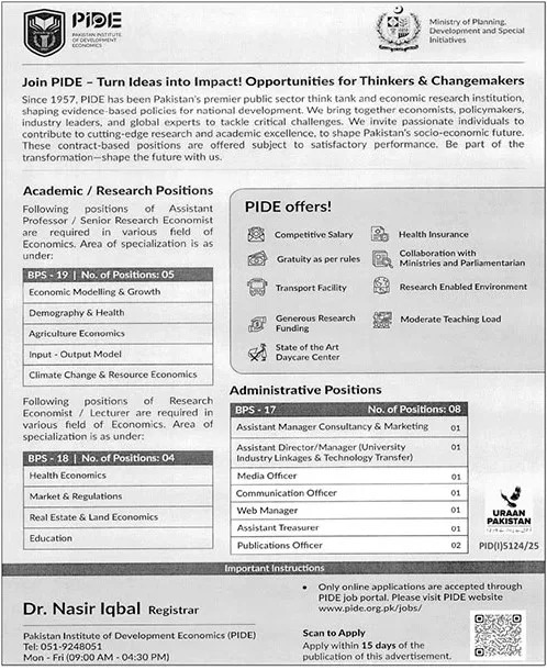 The Pakistan Institute of Development Economics (PIDE) has officially announced multiple academic, research, and administrative job opportunities for 2026, inviting passionate thinkers, researchers, economists, and professionals to become part of one of Pakistan’s most prestigious policy research institutions.