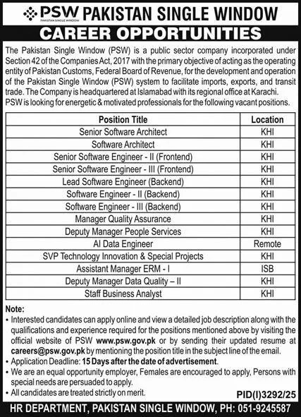 Pakistan Single Window PSW Jobs in Karachi Latest As the operating entity for Pakistan Customs and the Federal Board of Revenue, the PSW is responsible for developing and operating a system to facilitate imports, exports, and transit trade. With its headquarters in Islamabad and a regional office in Karachi, the company seeks talented individuals to join its mission. The deadline for applications is within 15 days of the date of the advertisement’s publication.