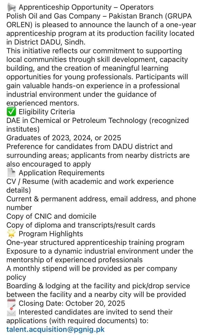 Polish Oil and Gas Company New Jobs 2025 This is an excellent opportunity for recent graduates to gain valuable hands-on experience in a professional industrial environment under the guidance of experienced mentors. The program is designed to provide a structured pathway into the oil and gas industry.