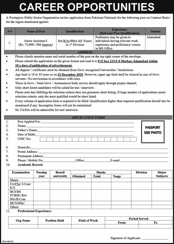 ISLAMABAD, Pakistan – A prestigious and progressive Public Sector Organization is inviting applications from highly qualified Pakistani Nationals for exciting career opportunities on a contract basis. This is an excellent chance to join a dynamic organization in a key administrative role within Islamabad.