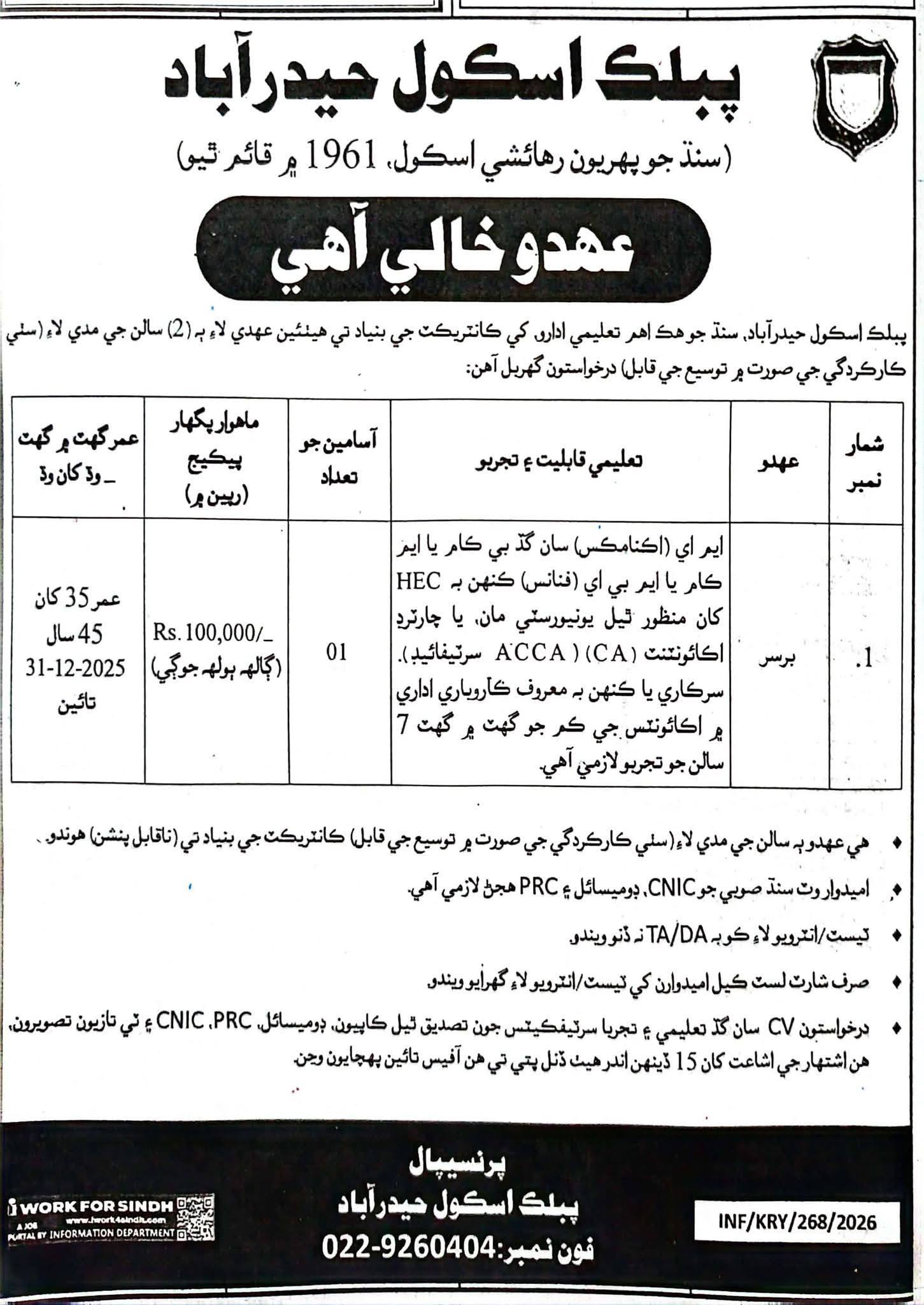 Public School Hyderabad New Jobs 2026 Public School Hyderabad, a landmark educational institution in Sindh established in 1961, is currently inviting applications for a key administrative leadership role. This institution has been a cornerstone of quality education in the region for over six decades, and it is now looking for a highly qualified professional to join its management team as a Bursar.