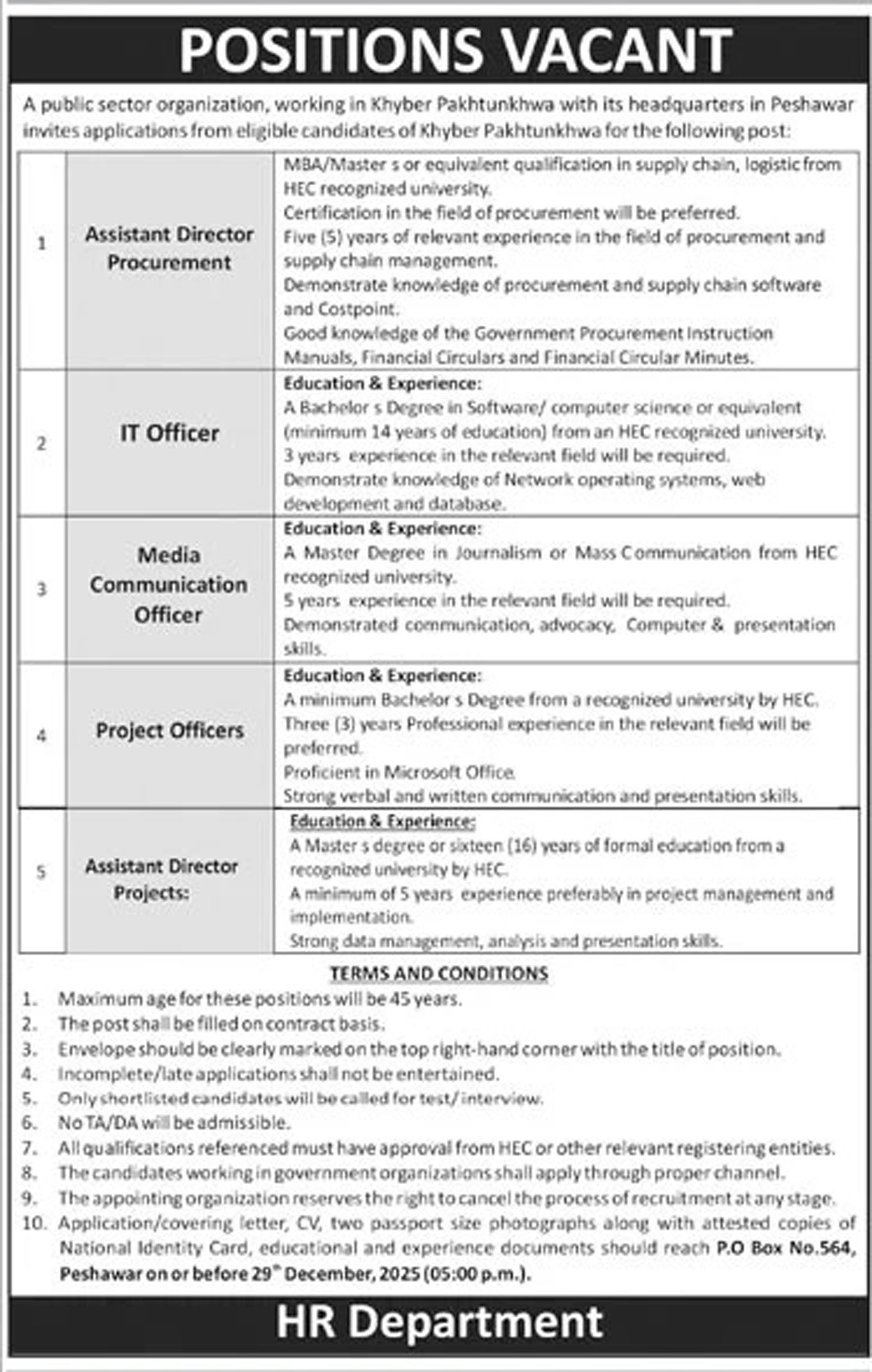 Public Sector Organization Jobs December 2025 A well-reputed public sector organization in Khyber Pakhtunkhwa (KP) has announced multiple Positions Vacant 2026 for qualified, experienced, and motivated professionals. These government jobs in Pakistan 2026 are based in Peshawar, offering an excellent opportunity for individuals seeking secure public sector employment in 2026.