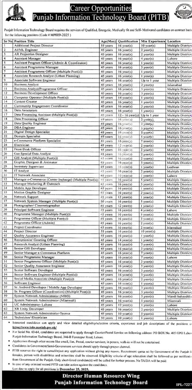 Punjab Information Technology Board PITB New Jobs December 2025