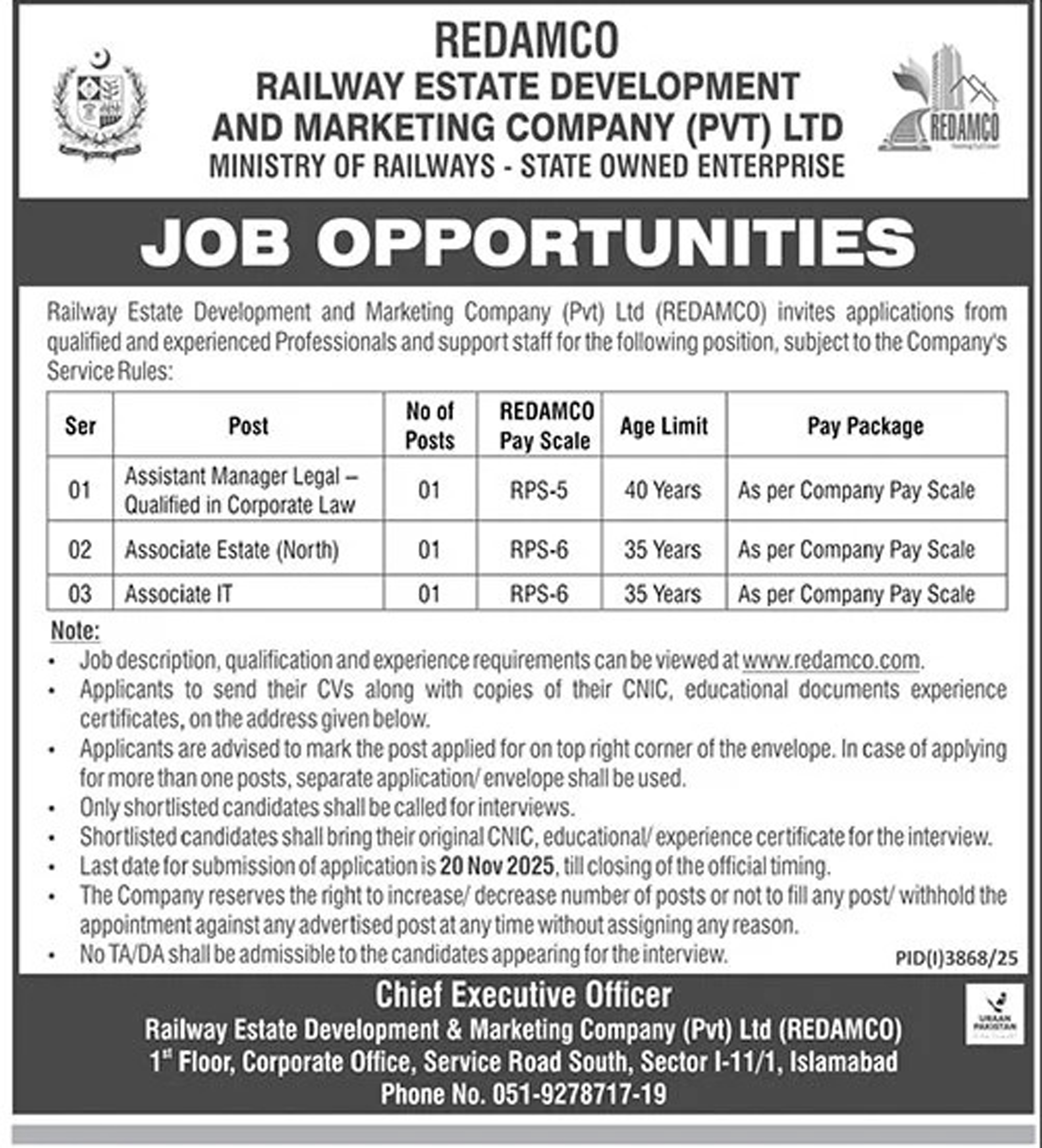 The Railway Estate Development and Marketing Company (REDAMCO), a state-owned enterprise under the Ministry of Railways, Government of Pakistan, has announced new job opportunities for 2025. REDAMCO invites applications from qualified and experienced professionals for multiple positions at its head office in Islamabad.