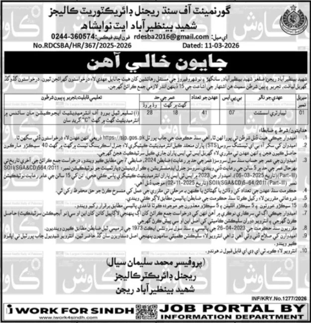 The Regional Directorate of Colleges, Shaheed Benazirabad (Nawabshah), has officially announced 41 vacant positions for the post of Laboratory Assistant (BPS-07). This recruitment is part of the Sindh Government’s initiative to strengthen the science departments of colleges across the division.