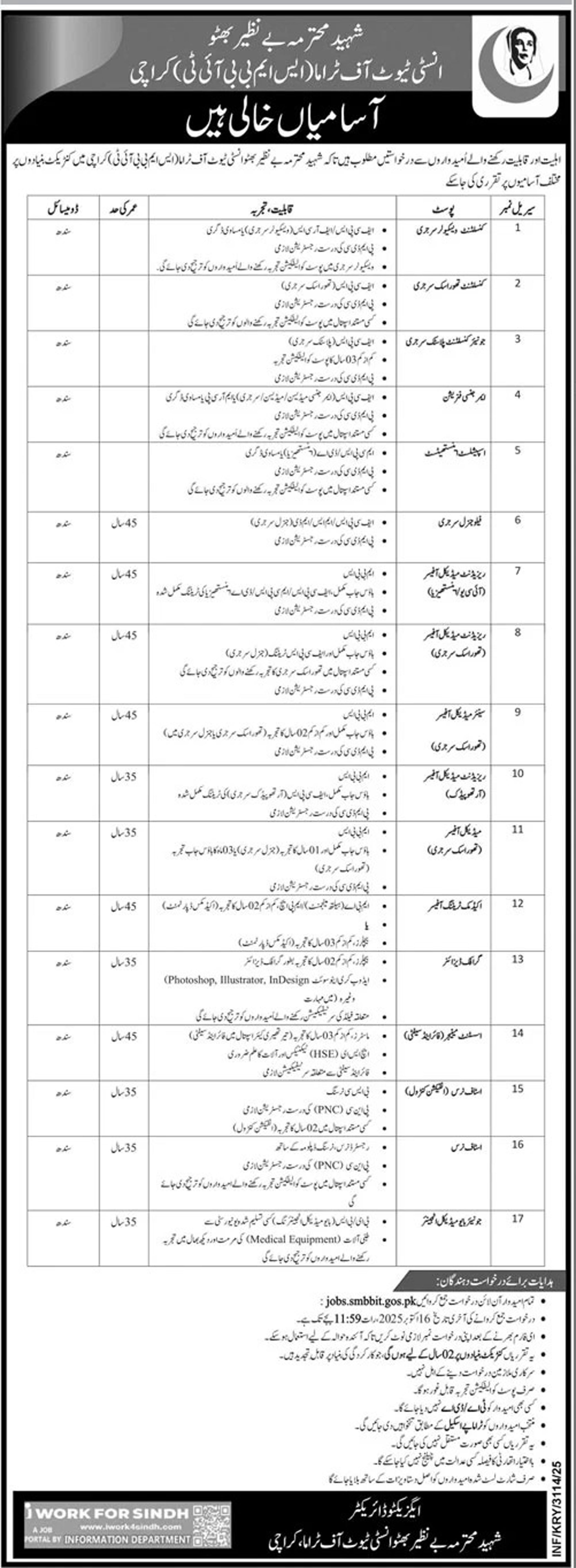 Shaheed Mohtarma Benazir Bhutto Institute of Trauma SMBBIT Jobs 2025