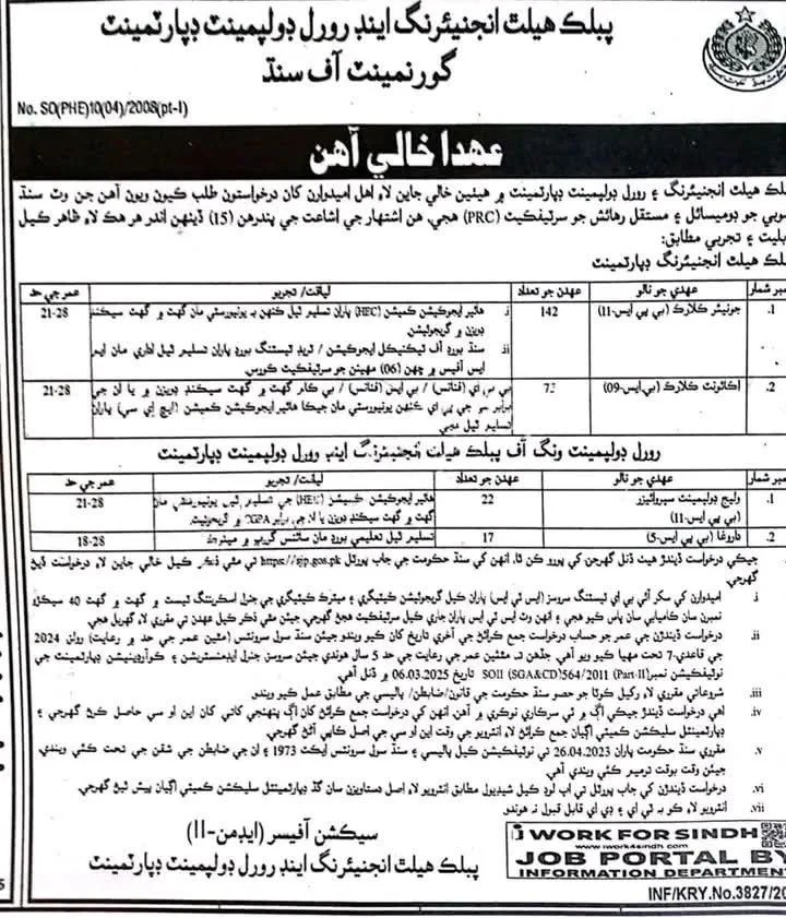 The Government of Sindh, Public Health Engineering and Rural Development Department, is inviting applications from eligible candidates who hold a Permanent Residence Certificate (PRC) and a Domicile of Sindh. This major recruitment drive aims to fill a large number of vacant positions across both the Public Health Engineering and Rural Development Wings of the department.