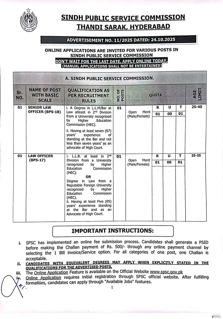 The Sindh Public Service Commission (SPSC) has invited online applications for two key legal positions within the commission itself. The vacancies are for a Senior Law Officer (BPS-18) and a Law Officer (BPS-17), as announced in Advertisement No. 11/2025. This is a significant career opportunity for experienced legal professionals to join the provincial civil service and work with a key constitutional body. The SPSC has emphasized that manual applications will not be entertained, and all candidates must apply online. The closing date for applications is November 14, 2025.