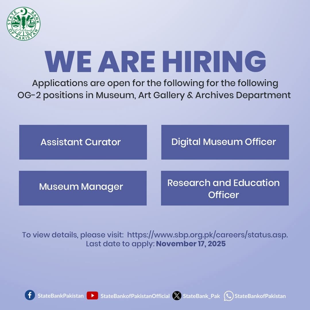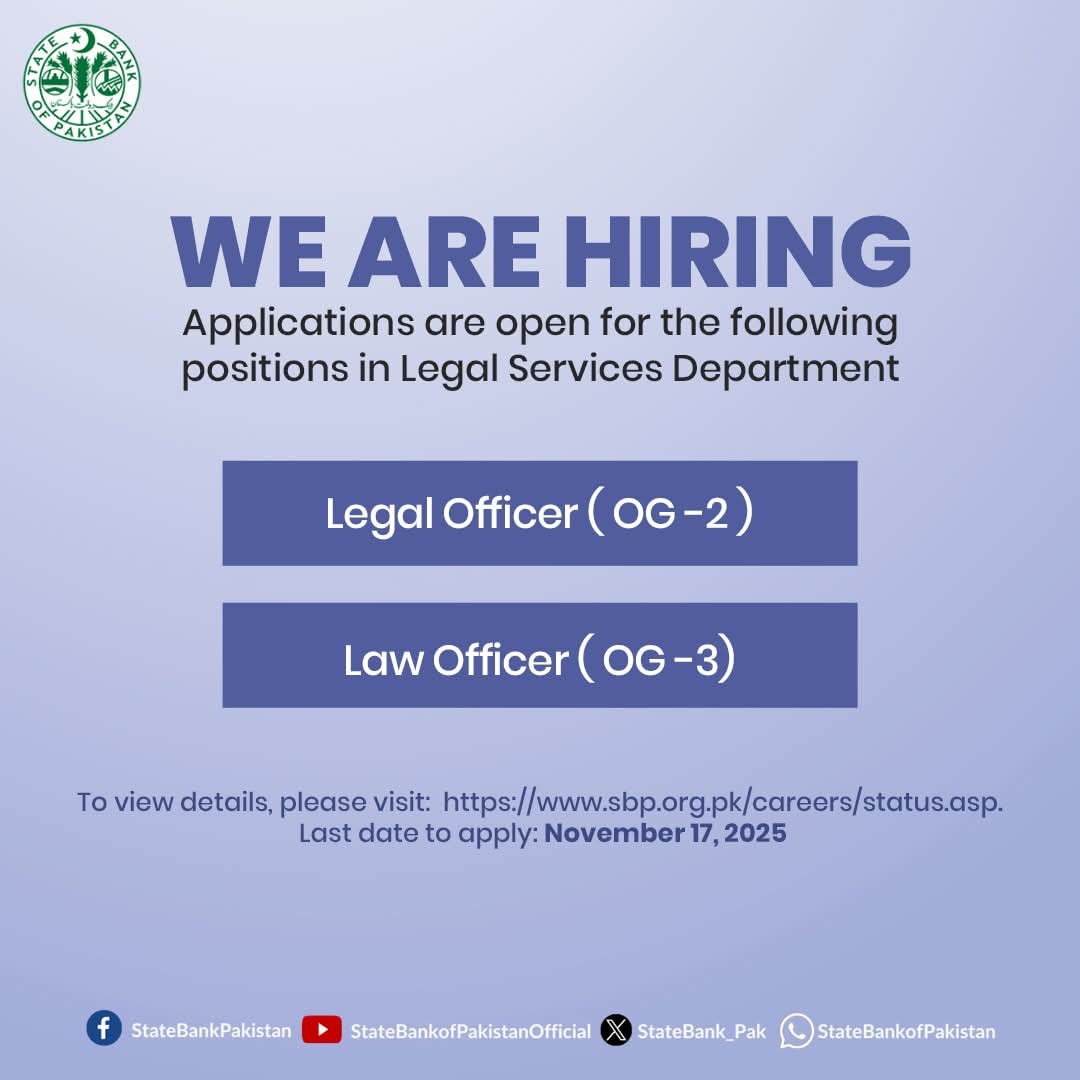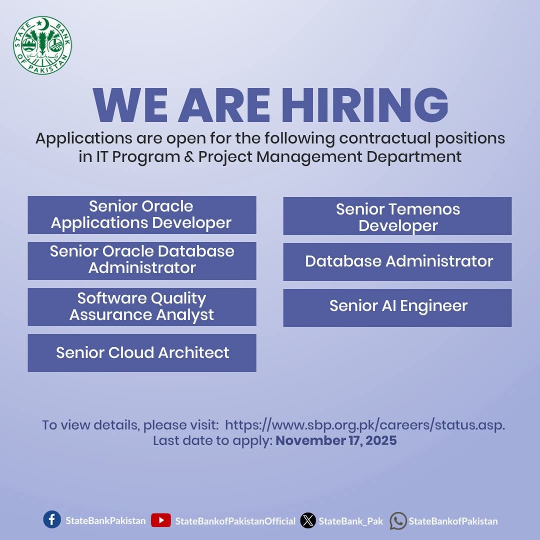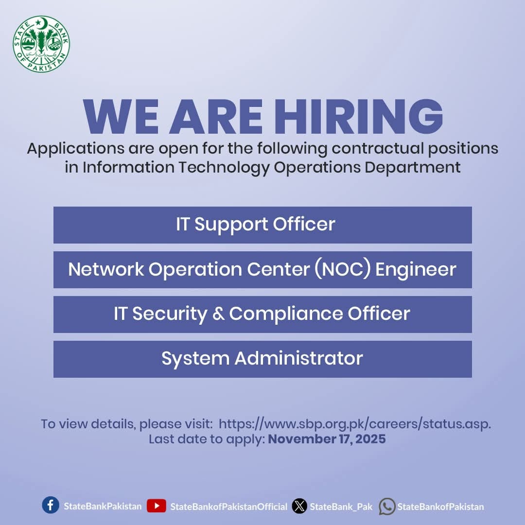 State Bank of Pakistan New Jobs 2025 SBP By idealjobs99 | November 4, 2025 0 Comment CAREER OPPORTUNITIES State Bank of Pakistan New Jobs 2025 SBP IMPORTANT INSTRUCTIONS & HOW TO APPLY Last date: November 17, 2025 Apply at: https://www.sbp.org.pk/careers/status.asp Post Views: 135