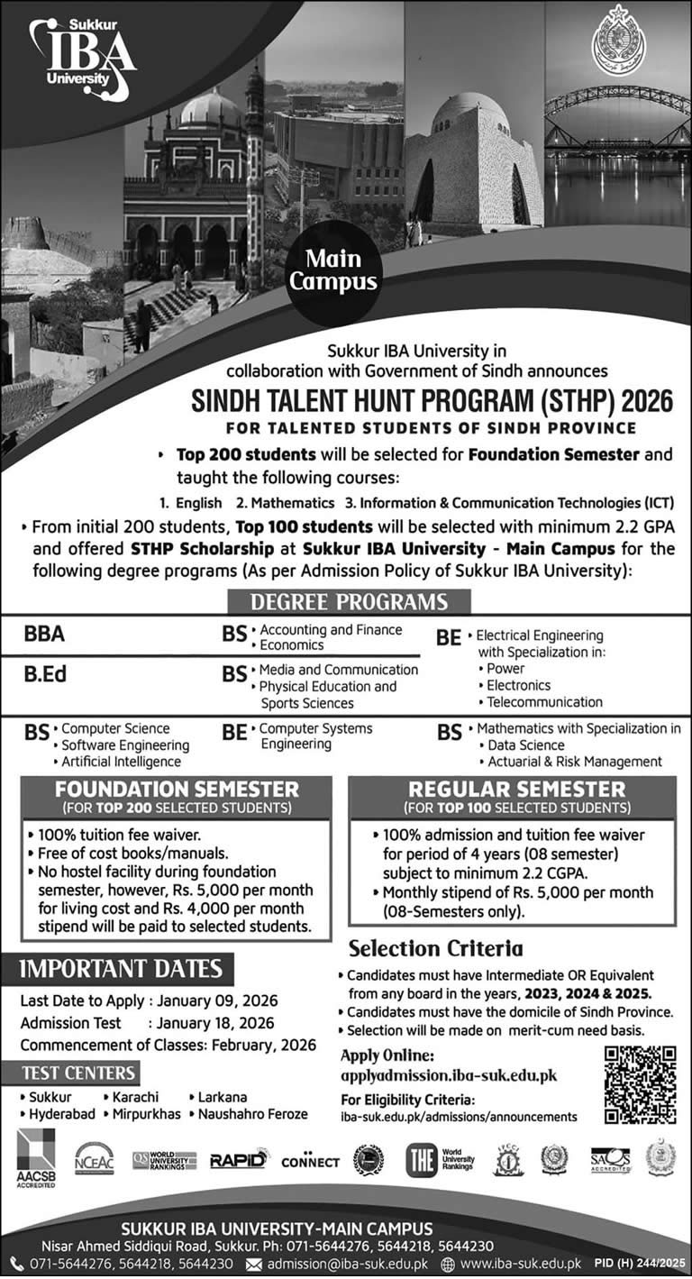 Sukkur IBA University Sindh Talent Hunt Program December 2025 Online Apply
