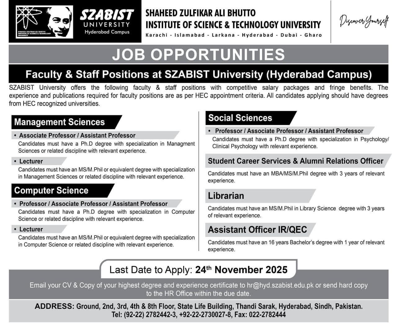 - For more queries, please get in touch with the HR department of SZABIST University Hyderabad Campus.