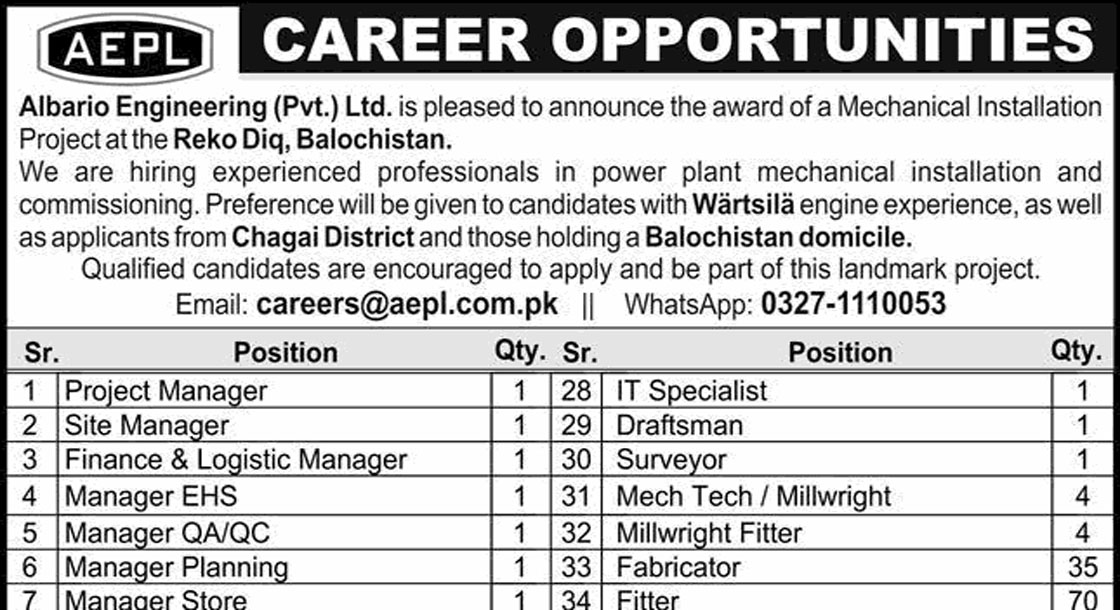 CAREER OPPORTUNITIES Albario Engineering Pvt Ltd Jobs 2026 We hope you achieve your goals and land a well-paying job. We over at https://idealjobs.pk are working hard towards your better future, and we hope you will always support our platform. VACANT POSITIONS IMPORTANT INSTRUCTIONS & HOW TO APPLY