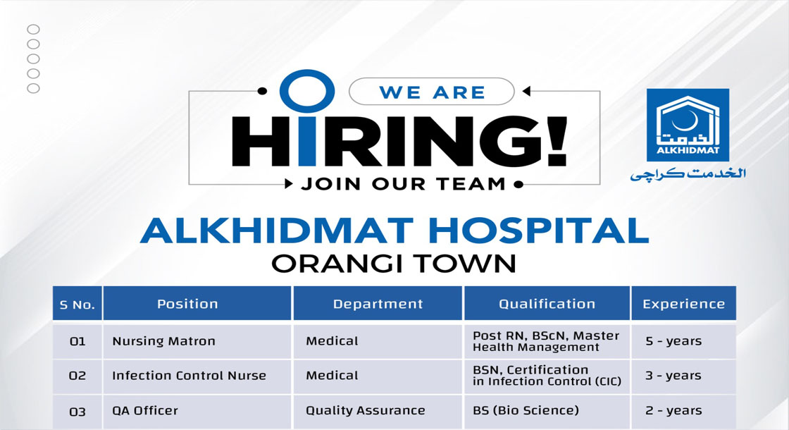 CAREER OPPORTUNITIES Alkhidmat Hospital Orangi Town Jobs 2025 We hope you achieve your goals and land a well-paying job. We over at https://idealjobs.pk are working hard towards your better future, and we hope you will always support our platform. VACANT POSITIONS IMPORTANT INSTRUCTIONS & HOW TO APPLY
