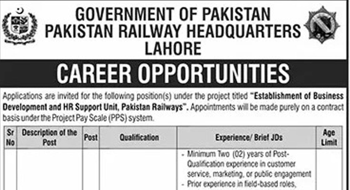 CAREER OPPORTUNITIES Pakistan Railways New Jobs 2025 Latest Advertisement The Government of Pakistan – Pakistan Railways Headquarters Lahore has officially announced new career opportunities for 2025 under its special project titled “Establishment of Business Development and HR Support Unit, Pakistan Railways.” VACANT POSITIONS