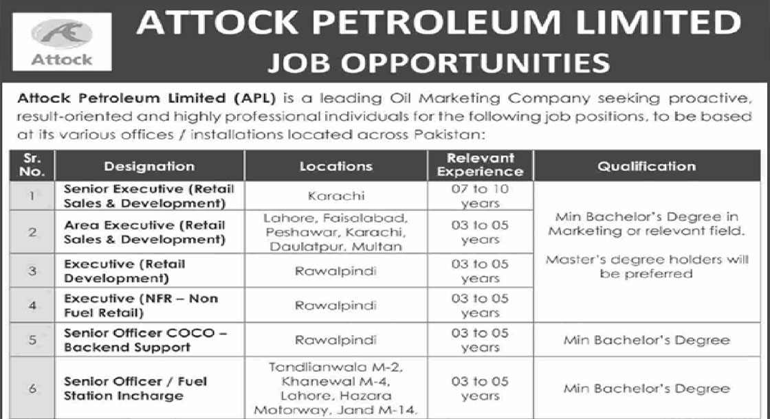 CAREER OPPORTUNITIES Attock Petroleum Limited Jobs April 2026 We hope you achieve your goals and land a well-paying job. We over at https://idealjobs.pk are working hard towards your better future, and we hope you will always support our platform. VACANT POSITIONS IMPORTANT INSTRUCTIONS & HOW TO APPLY