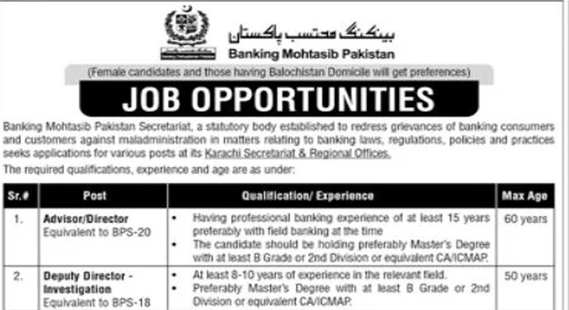 CAREER OPPORTUNITIES Banking Mohtasib Pakistan Karachi Jobs 2025 The Banking Mohtasib Pakistan Secretariat, a statutory body established to redress the grievances of banking consumers, has invited applications for various posts at its Karachi Secretariat and Regional Offices. The organization is seeking to fill positions ranging from senior Advisor/Director roles to Office Assistants. This is an… Read More »