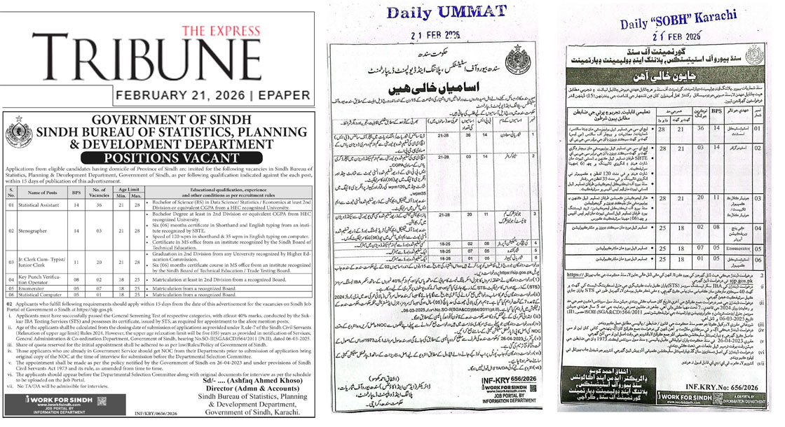CAREER OPPORTUNITIES Bureau of Statistics Sindh New Jobs 2026 Sindh Job Portal   We hope you achieve your goals and land a well-paying job. We over at https://idealjobs.pk are working hard towards your better future, and we hope you will always support our platform. VACANT POSITIONS IMPORTANT INSTRUCTIONS & HOW TO APPLY