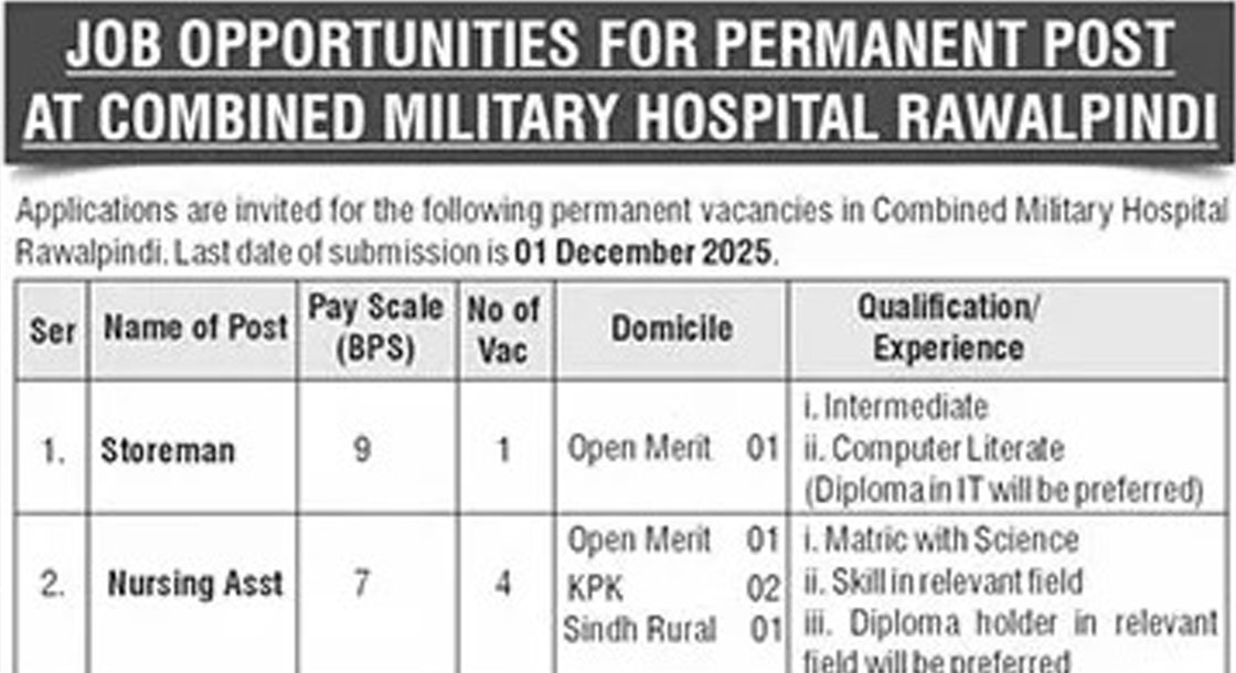 CAREER OPPORTUNITIES Combined Military Hospital CMH Jobs 2025 Combined Military Hospital (CMH) Rawalpindi has announced multipleĀ permanent job opportunitiesĀ for eligible Pakistani citizens. This new recruitment drive offers positions ranging from technical and skilled roles to basic support staff. Interested candidates can apply for various posts according to their qualifications, experience, and domicile criteria. VACANT POSITIONS IMPORTANT… Read More »