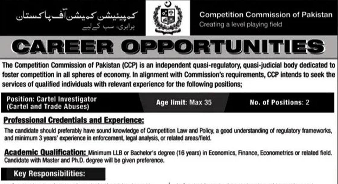 CAREER OPPORTUNITIES Competition Commission of Pakistan CCP Jobs 2025 Apply Online The Competition Commission of Pakistan (CCP) has announced the latest jobs in Pakistan 2025 for qualified professionals. CCP is a vital regulatory body that ensures fair competition in the economy by preventing monopolies, cartelization, and unfair trade practices. With its latest career opportunities in 2025, the Commission is inviting… Read More »