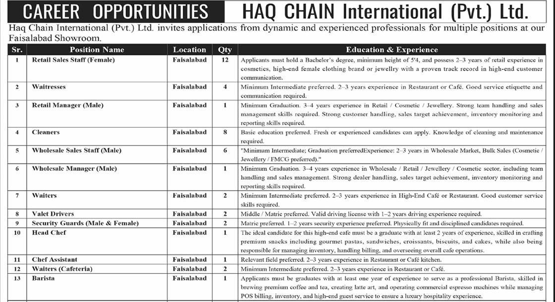 CAREER OPPORTUNITIES Haq Chain International Pvt Ltd Faisalabad Jobs 2026 We hope you achieve your goals and land a well-paying job. We over at https://idealjobs.pk are working hard towards your better future, and we hope you will always support our platform. VACANT POSITIONS IMPORTANT INSTRUCTIONS & HOW TO APPLY